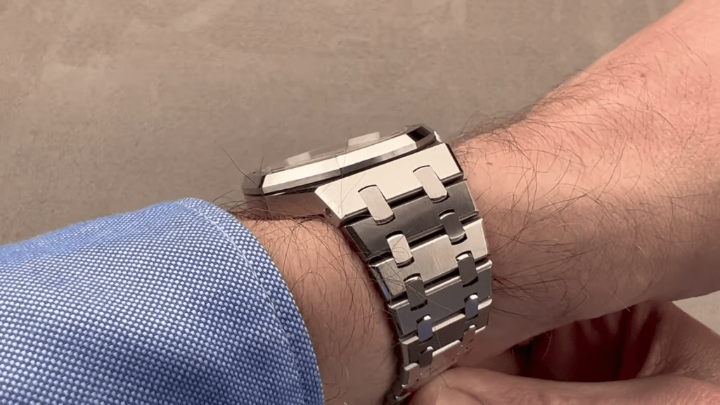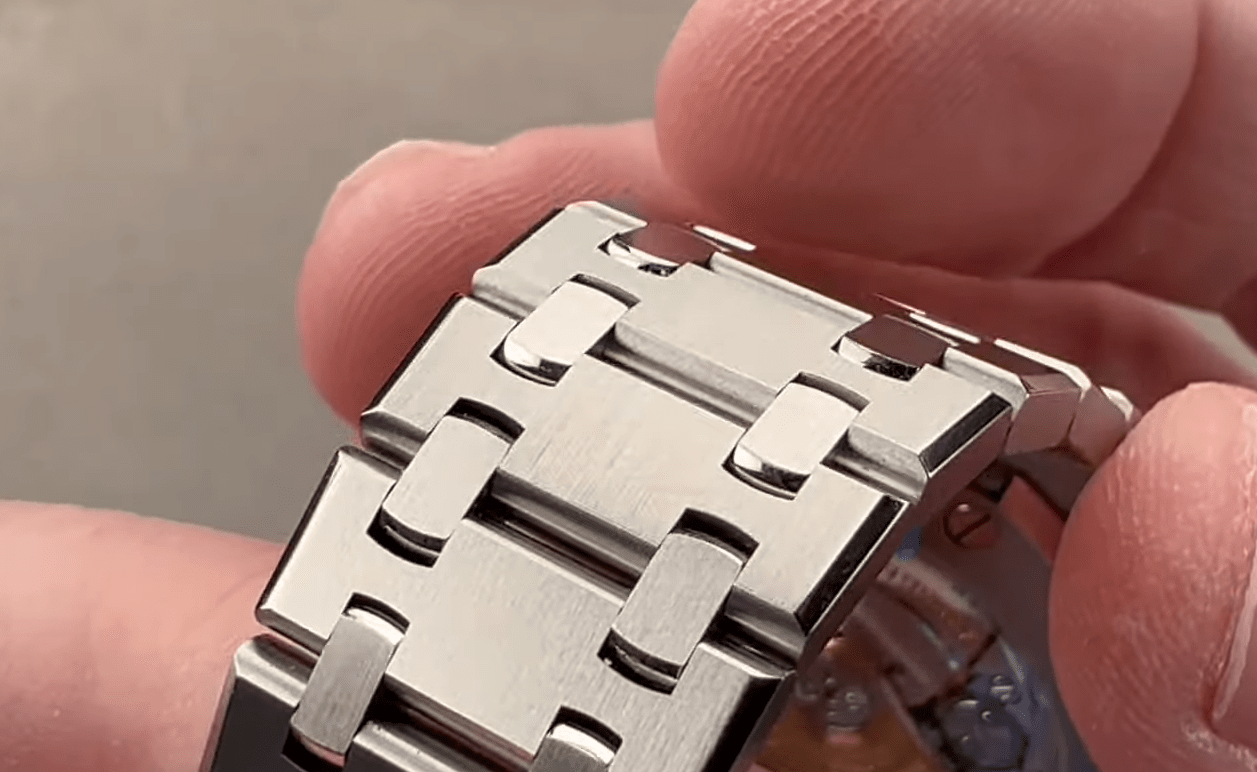 The bevel of the case expands as it rides down the log hoods, and then it’s continued perfectly aligned across the shoulders of the links. The links and profiles are vertically satiated, and from the top, they’re longitudinally saturated. You can see the intermediate planks; they’re actually polished internally. So, as you roll the bracelet and take a look at those intermediate plots, you can see that they’re polished in a way that’s only really visible when you bend the bracelet. We love this detail and be sure, the planks are polished on our superclone AP watches as well!