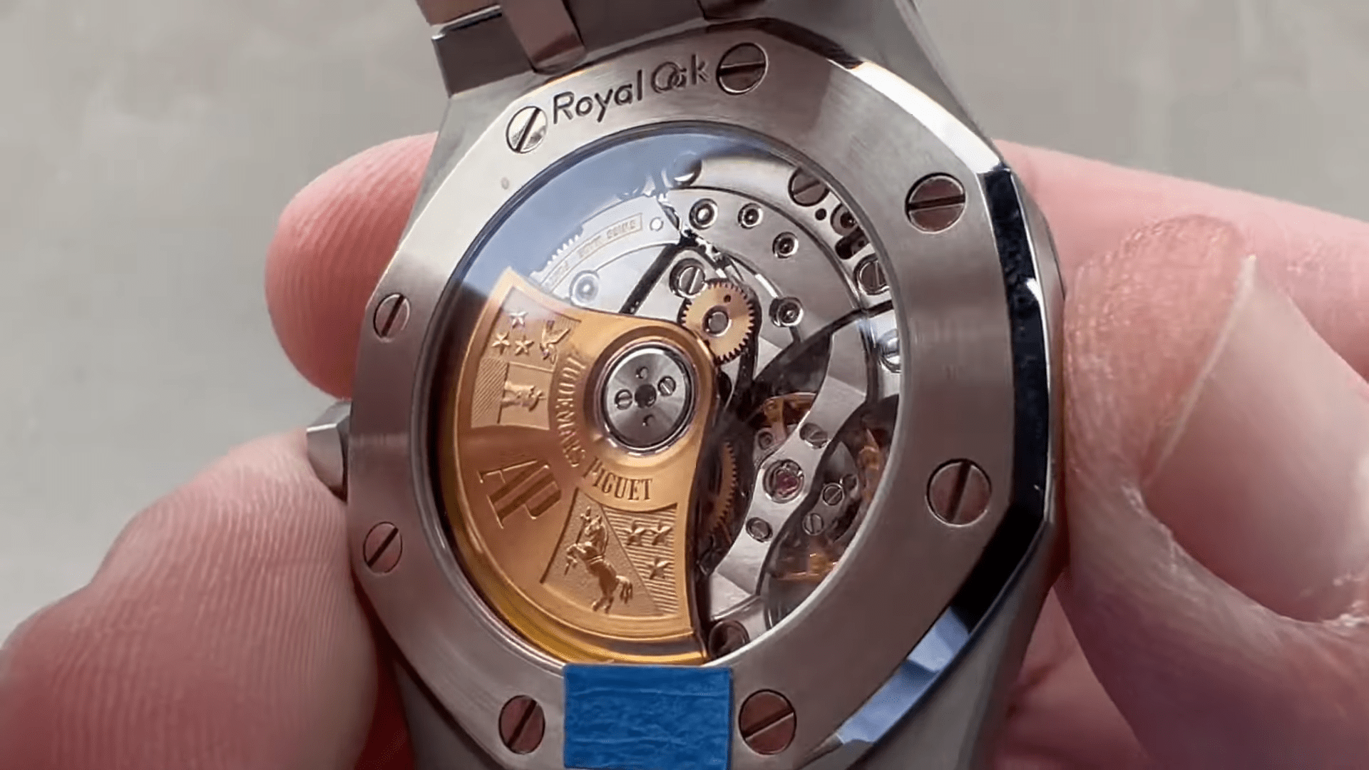 On the back, you can see an Audemars Piguet movement, the 3120 automatic winding. It’s quite tough with a full balance bridge, a freeze-prone balance, and relatively thin construction. It was designed with the Royal Oak offshore in mind, so it’s more than tough enough for this application.
