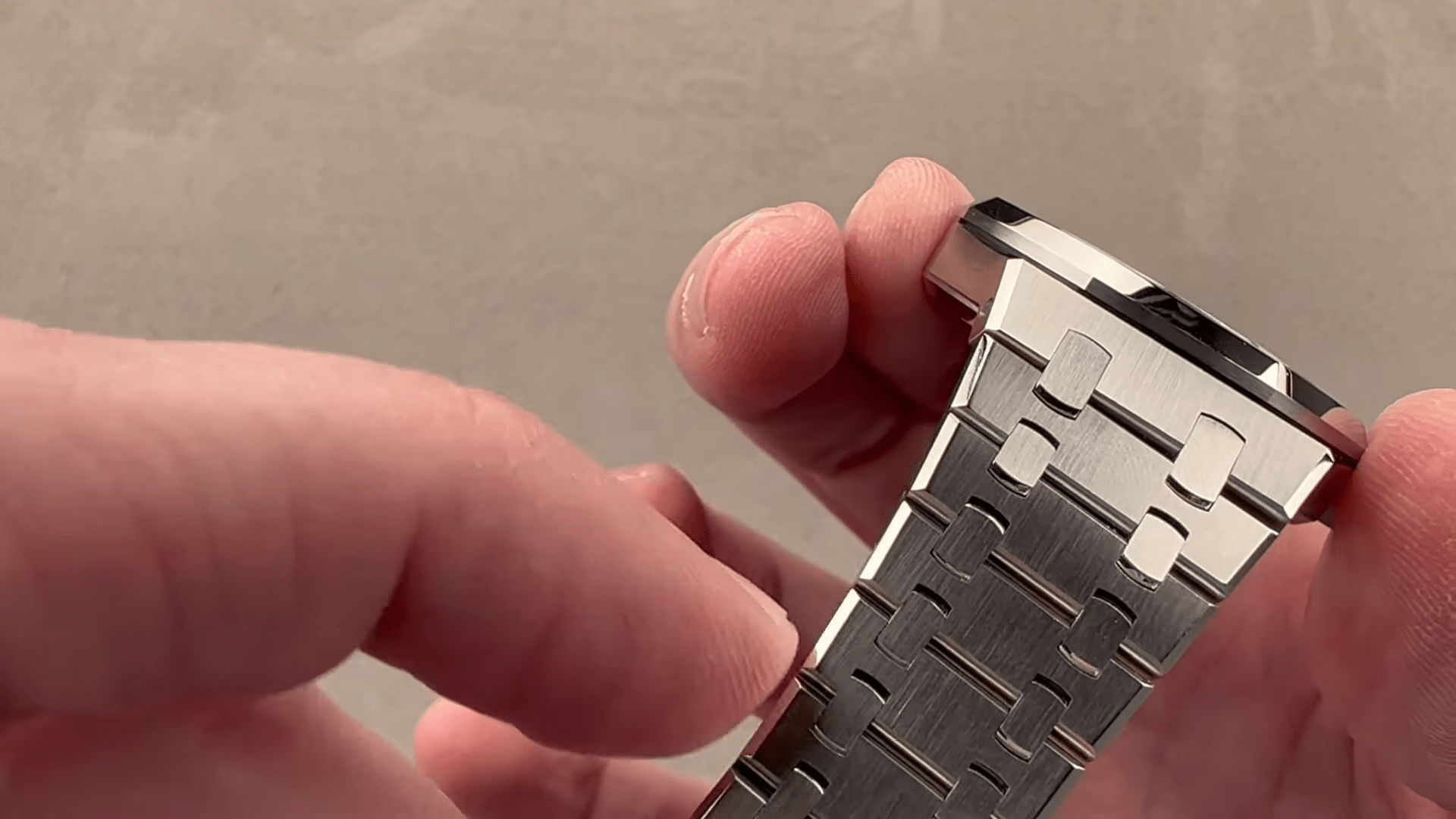 Now, taking a quick look at the watch, it’s finished in Immaculate fashion. I always feel you get a bit shortchanged if you buy a Royal Oak on a strap. Full bracelet is how Gerald Genta invented the watch in 1972, and full bracelet is how he envisioned it as he was principally a jewelry designer, and he envisioned the Royal Oak as a piece of jewelry for a man that just happened to feature a timepiece. So, the case flows into the lugs and flows into the bracelet seamlessly one into the other. The steps are so seamless that when you pull the bracelet to one side, you can’t actually feel the steps even though you can see the curvature.
